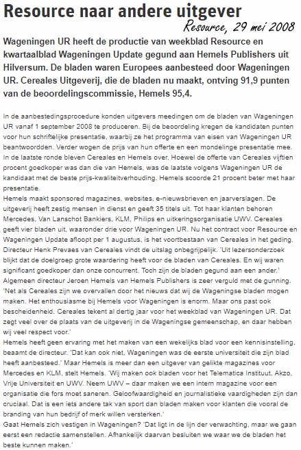 In alle reacties en adhesiebetuigingen wordt naar mijn smaak een aspect over het hoofd gezien. De redactie van Resource - en daarmee Cereales Uitgeverij als geheel - heeft de afgelopen jaren steeds enorm de nadruk gelegd op de journalistieke waarden terwijl Resource en al haar voorgangers altijd al 'vrijheid in gebondenheid' kenden. Naar mijn overtuiging heeft de redactie het aan zichzelf te danken dat de koers gelopen is en wordt nu strategisch opnieuw zo gehandeld dat 'boeman' Aalt aan het langste eind trekt.