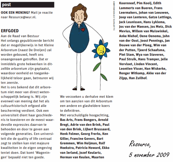 Zo'n vijftig hoogleraren van Wageningen Universiteit pleiten in een brief aan de raad van bestuur voor behoud van het Klein Arboretum als cultuurhistorisch erfgoed. Ze keren zich tegen het plaatsen van hekken en de bouw van woningen op dit terrein.